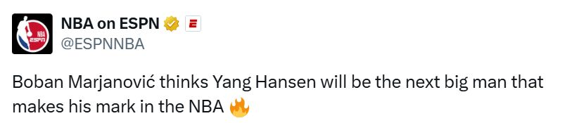 随后,名记文霍斯特表示:“杨瀚森有可能成为NBA里很重要的球员,因为他关系到NBA能否重新激活中国市场。要知道,我们已经过了“姚明时代”,但姚明当年在中国培养了数以百万计的NBA球迷,所以中国市场对NBA来说至关重要。”